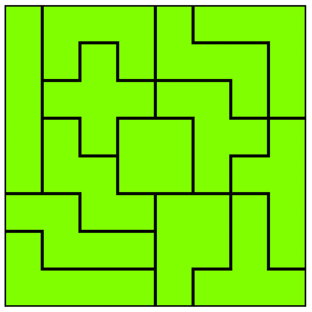 It is an 8×8 square tile puzzle with 13 pieces. 12 of them consists of an area of 5 squares while the middle square piece an area of 4 squares. If you do the math,