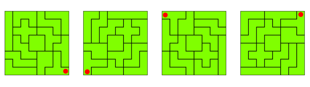 A square has order of symmetry is 4. In other words, you could rotate a square by an angle of 90 degrees and it will have the same orientation as before. The four squares below consists of the same unique solution. Just observe the position of the 4 red dots.