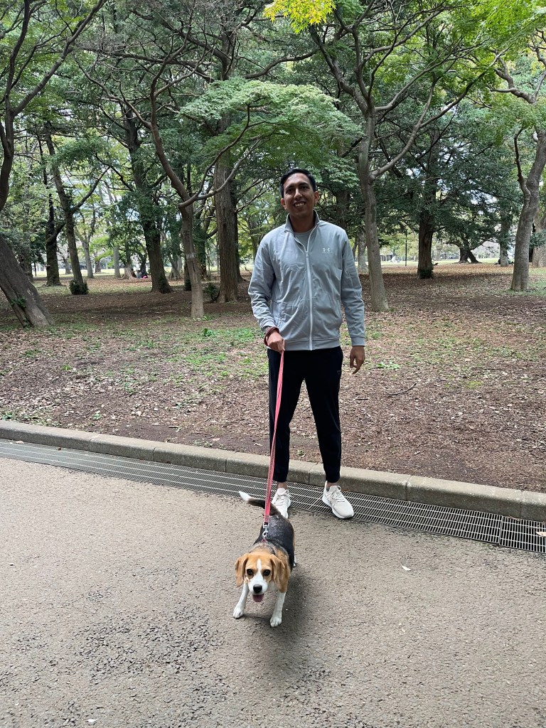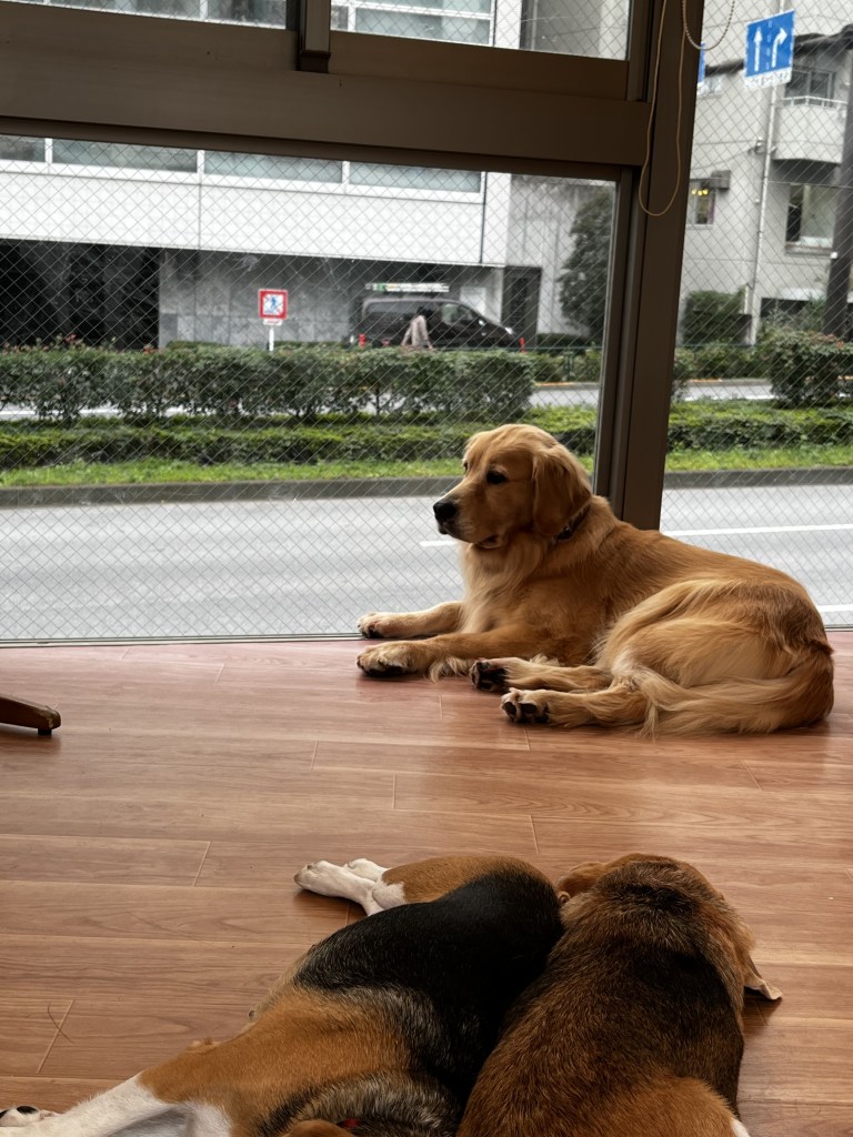 After spending an hour relaxing with the dogs, we faced the tough decision of choosing which one to take for a walk to Yoyogi Park. Ultimately, we settled on a beagle named RunRun. She appeared well-behaved and leaped with excitement when the owner fastened her leash.