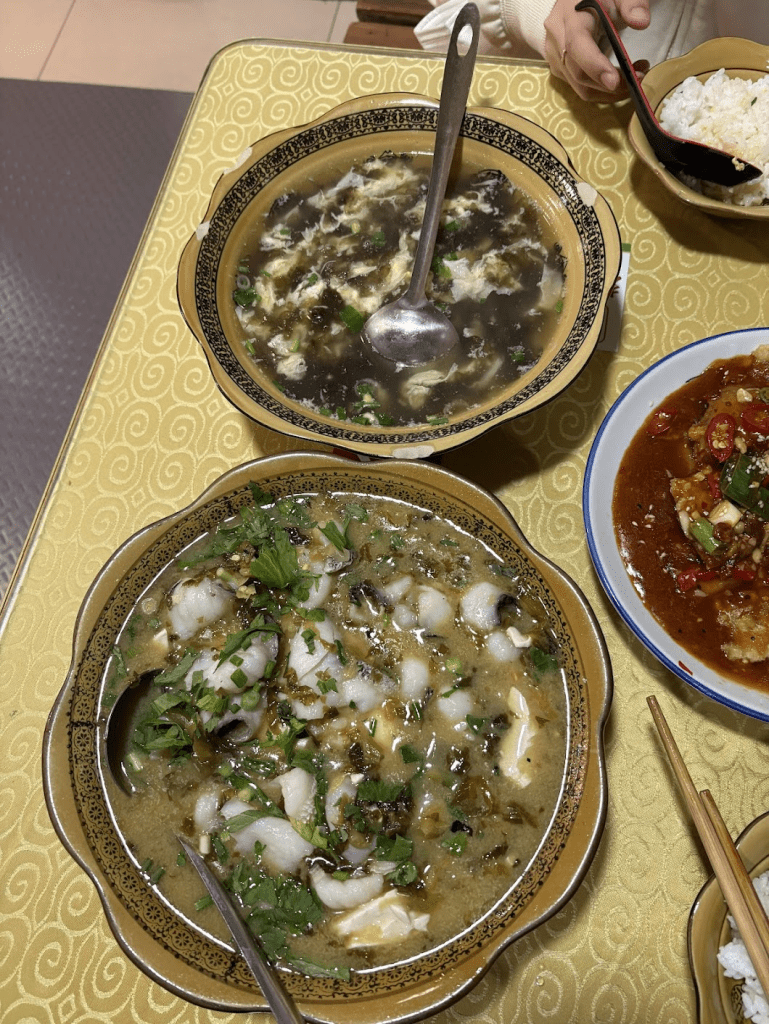 We headed to a local restaurant. We spent under 200 yuan for a huge meal. The meal consisted of Sauerkraut Fish, Scrambled Eggs, Sautéed Vegetables, and Egg Drop Soup.
