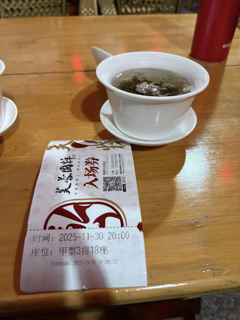 It was only five in the afternoon, and the sun was starting to set. We grabbed a quick meal before heading to the Sichuan Opera Theater. Arriving early, we collected our tickets and were invited to enjoy some tea in the basement before the show. We relaxed and sipped the warm tea while watching other guests arrive.